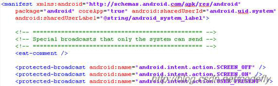 我们在frameworks/base/core/res/AndroidManifest.xml文件中,可以看到<protected-broadcast>标记的具体写法,截选如下: