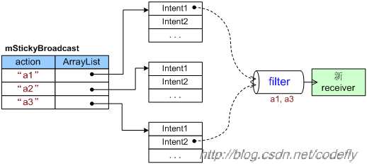 图中新receiver的filter只对a1和a3这两个action感兴趣,所以遍历时就不会考虑mStickyBroadcast表中的a2表项对应的子表,而a1、a3子表所对应的若干intent中又只有一部分可以和filter匹配,比如a1的intent1以及a3的intent2,所以图中只选择了这两个intent递送给新receiver。