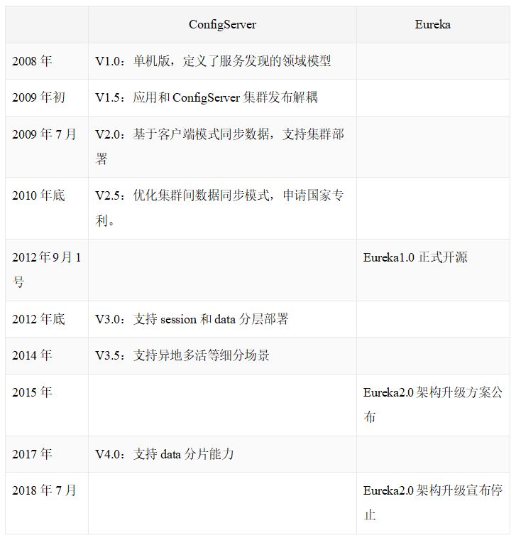 阿里巴巴早在 2008 就开始了服务化的进程,在那个时候就就已经自研出服务发现解决方案(内部产品名叫 ConfigServer)。