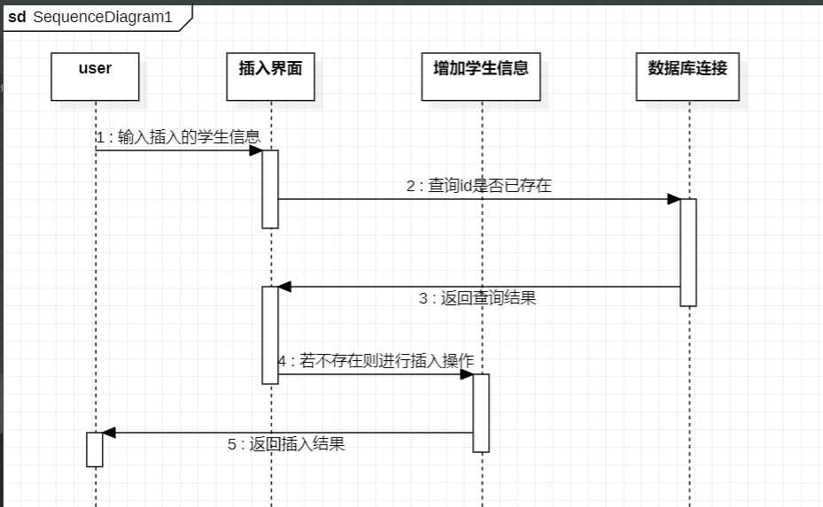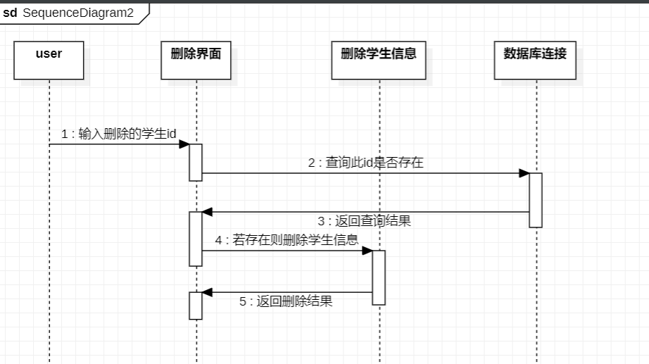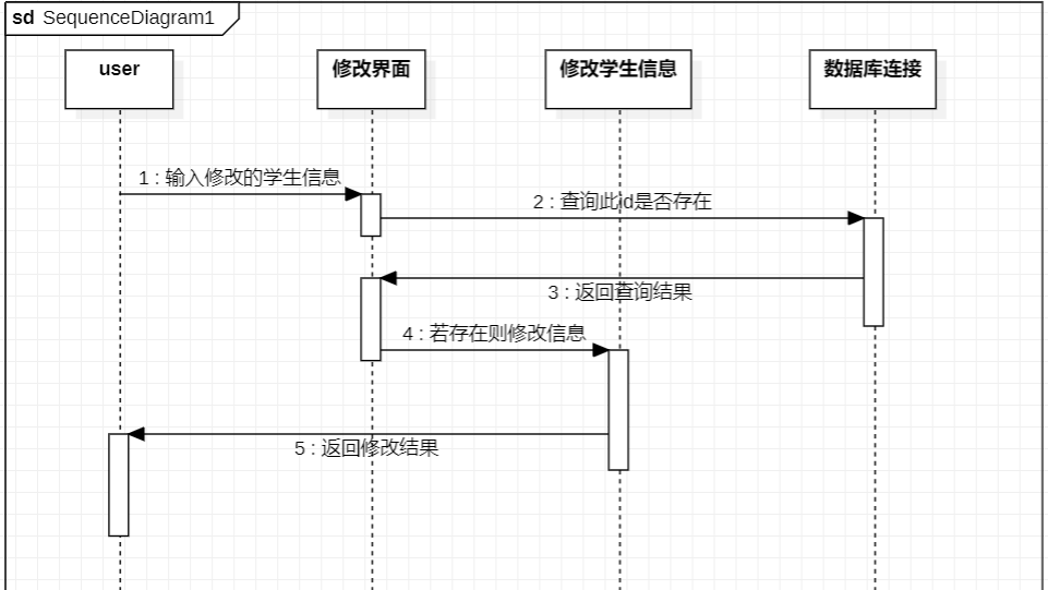 任务3:结合实验五中学生信息增、删、改的操作过程,绘制某一user对象完成学生信息增、删、改的顺序图,除user对象外,顺序图中其他对象需为实验五资源包中定义的类对象。
