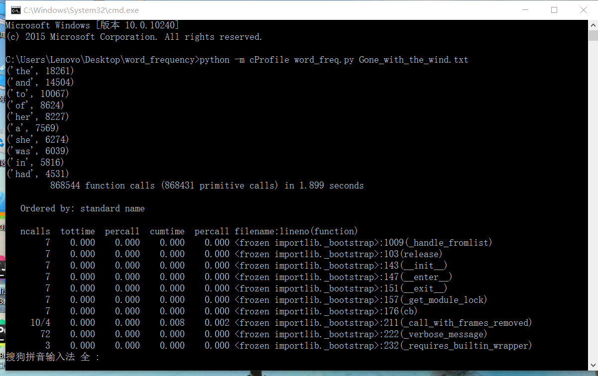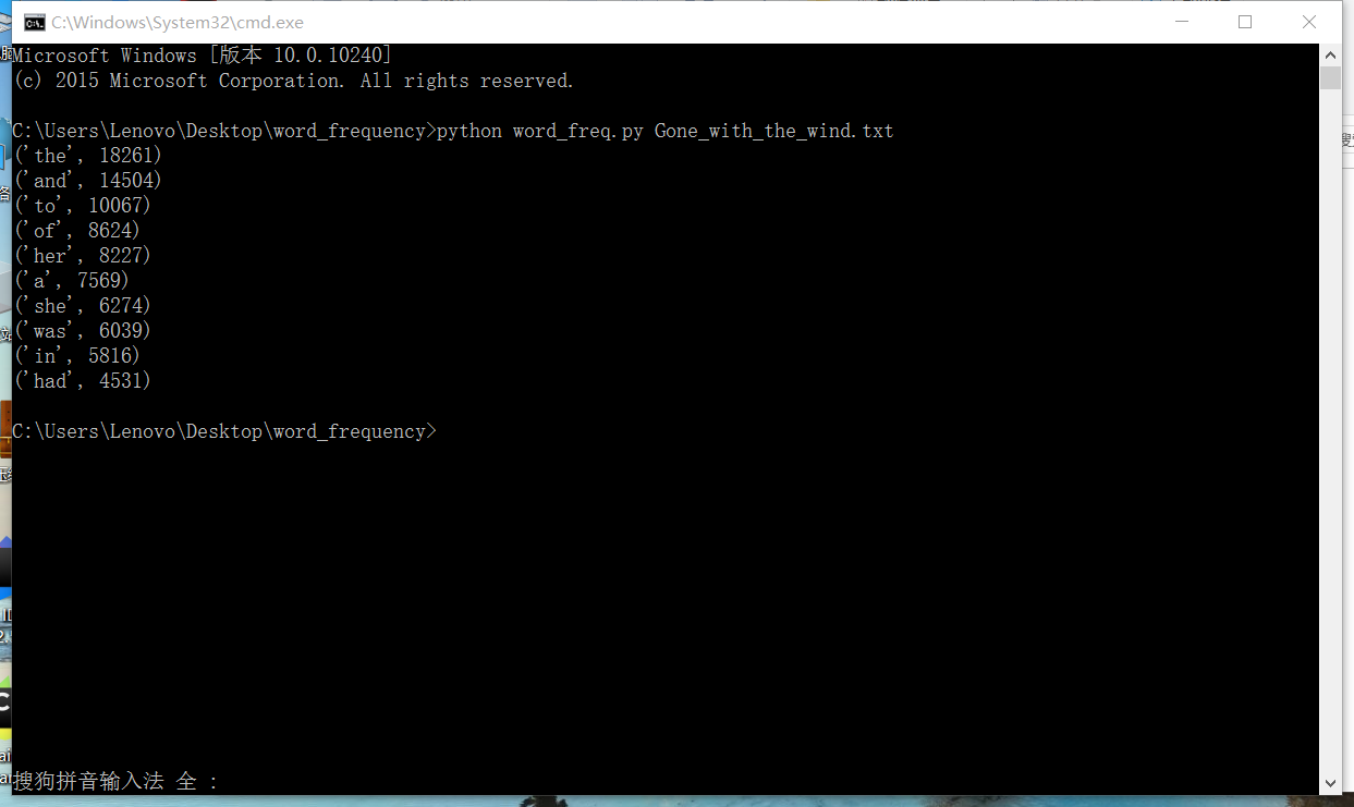 在命令符中输入python word_freq.py Gone_with_the_wind.txt运行代码