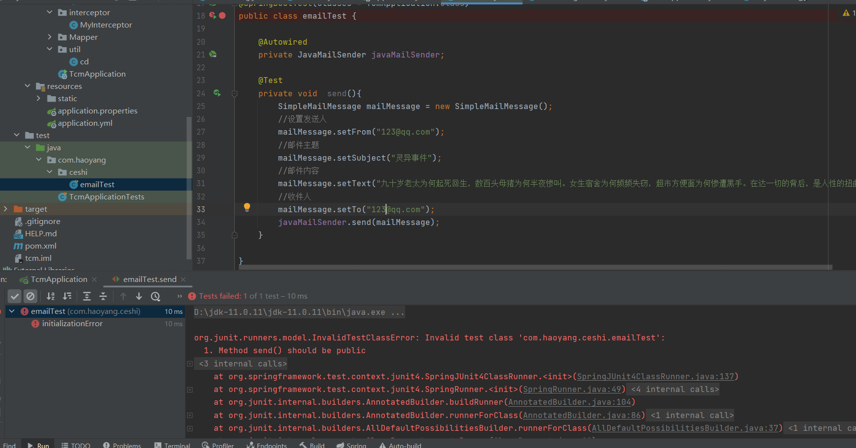 注意,有些人在private JavaMailSender javaMailSender;中可能会提示报错