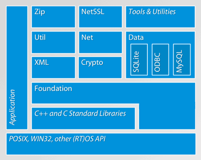 下图摘自 POCO 官网。OS API 是使用操作系统层的,C++/C Standard Libararies 是标准库,其他的模块都是 POCO 所提供的,包括:Foundation、XML、Crypto、XML、Util、Net、Zip、NetSSL、Data(支持 SQLite、ODBC、MySQL)、Tools & Utilities、Application。
