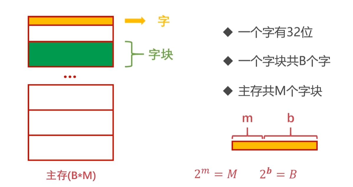 例题:假设主存用户空间容量为 4G,字块大小为 4M,字长为 32 位,则对于地址中块地址 m 和 块内地址 b 的位数,至少应该为多少?4G = 4096M字块数: 4096 ÷ 4 = 1024 个字块地址m:log₂1024 = 10块内字数:4M ÷ 32bit = 1048576块内地址:log₂1048576 = 20所以: m ≧ 10,b ≧ 20