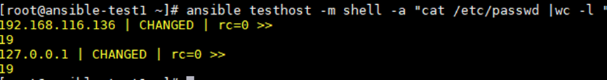 ansible testhost -m shell -a "cat /etc/passwd |wc -l "