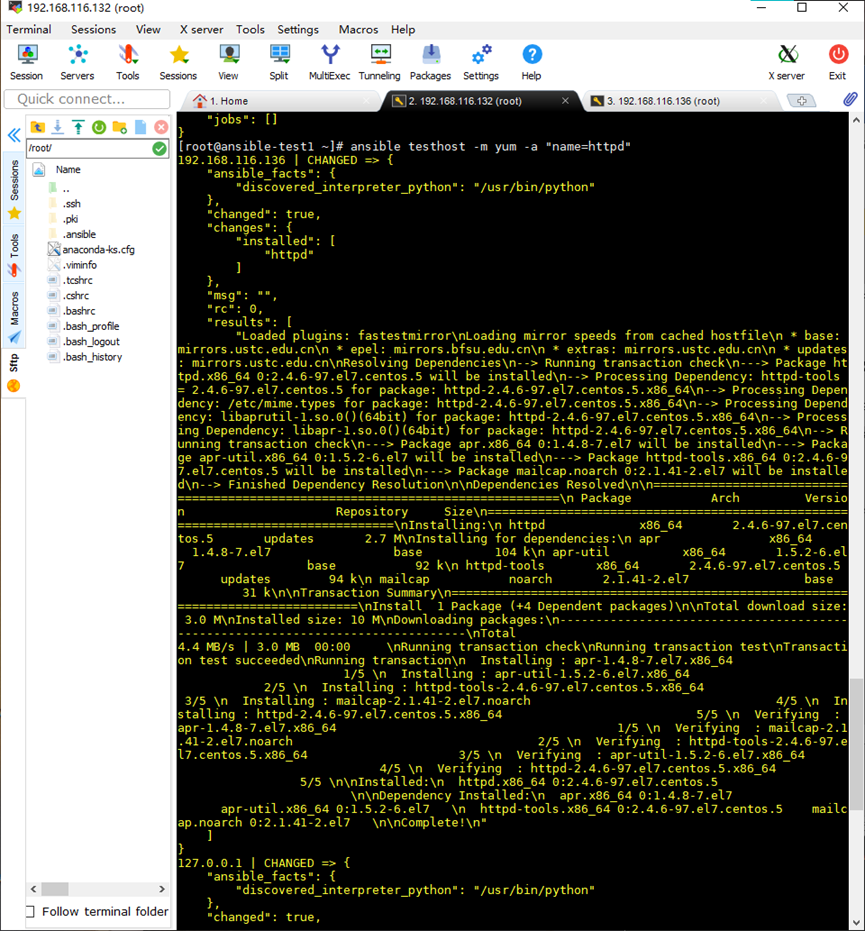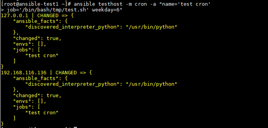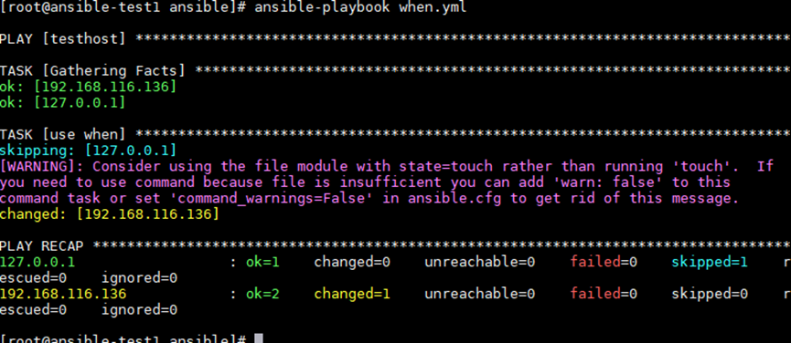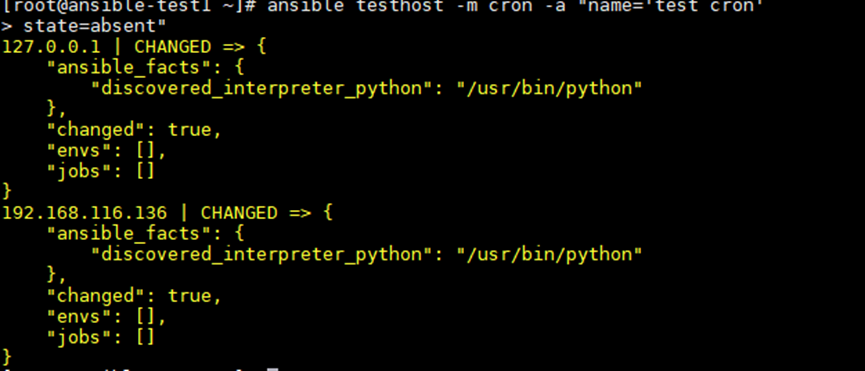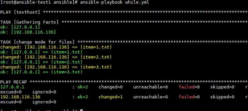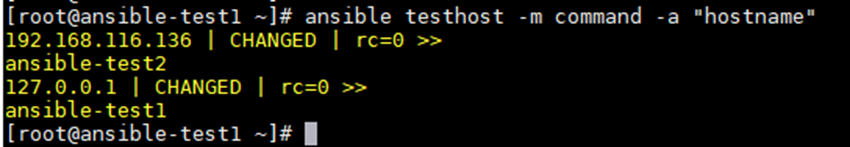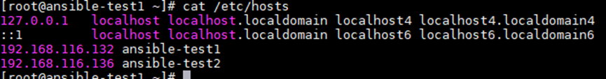 192.168.x.x ansible-test1 //添加两台主机的IP和主机名