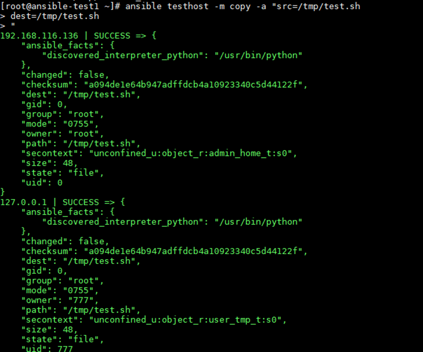 ansible testhost -m copy -a "src=/tmp/test.sh