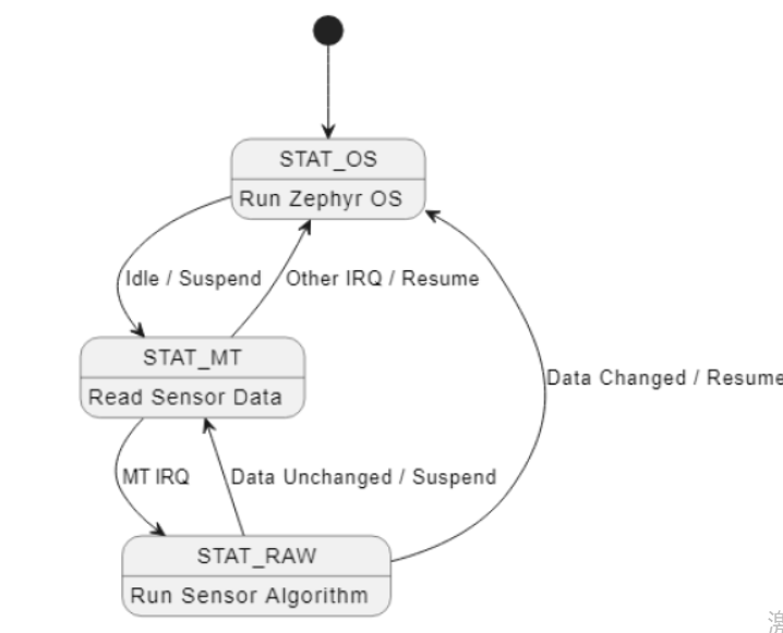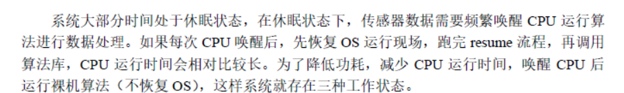 STAT_RAW:裸机运行态,CPU 运行,OS不运行;Sensor Sleep通过wakeup callback调用裸机算法,为节省功耗不用唤醒OS,计算完成后根据算法结果来决定休眠还是唤醒OS。