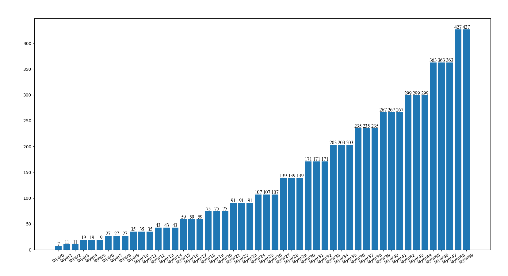 import pandas as pd import numpy as np def reception_cal(*args, start_reception=1, start_strides=1, show_bar=False): ''' all input must be formed into tuple (kernel_size, stride, padding) ''' reception = start_reception standard_params = 0 record = {'kernel_size':['', ], 'stride':['', ], 'padding':['', ], 'stride_cummul':[start_strides, ], 'reception':[reception]} for kernel_size, stride, padding in args: record['kernel_size'].append(kernel_size) record['stride'].append(stride) record['padding'].append(padding) reception += (kernel_size - 1) * record['stride_cummul'][-1] stride_cumsum = record['stride_cummul'][-1] * stride record['stride_cummul'].append(stride_cumsum) record['reception'].append(reception) standard_params += kernel_size ** 2 out_table = pd.DataFrame(record) pd.set_option('colheader_justify', 'center') print(out_table) print('standard conv params:{}'.format(standard_params)) if show_bar: import matplotlib.pyplot as plt receptions_show = np.array(record['reception'][1:]).astype(np.float64) plt.bar(np.arange(len(receptions_show)), receptions_show, tick_label=['layer{}'.format(i) for i in range(len(receptions_show))]) plt.xticks(rotation = 30) # plt.plot(np.arange(len(receptions_show)), receptions_show, "b", marker='o', ms=10, linewidth=2) # plt.fill_between(np.arange(len(receptions_show)), receptions_show, 0, color='blue', alpha=.3) for i in range(len(receptions_show)): plt.text(np.arange(len(receptions_show))[i], receptions_show[i] + 1, '{}'.format(int(receptions_show[i])), size=12, ha='center', family="Times new roman") plt.get_current_fig_manager().window.state('zoomed') plt.show() def judge_dwconv_replace(kernel_size=3, in_channels=256, out_channels=256): standard_params = in_channels * out_channels * kernel_size ** 2 deepconv_params = in_channels * kernel_size ** 2 pointconv_params = in_channels * out_channels * 1**2 dp_params = deepconv_params + pointconv_params print('standrad conv params:{}'.format(standard_params)) print('deepwise separable params:{}'.format(dp_params)) print('d : s : {:.5}, params_reduce:{}'.format(dp_params / standard_params, dp_params / standard_params < 1.0)) if __name__ == '__main__': # resnet-50 test kernel_size_list = [(7, 2, 3), (3, 2, 1)] + [(1, 1, 0), (3, 1, 1), (1, 1, 0)] * 3 reception_cal(*kernel_size_list) # conv3_x kernel_size_list += [(1, 1, 0), (3, 2, 1), (1, 1, 0)] + [(1, 1, 0), (3, 1, 1), (1, 1, 0)] * 3 reception_cal(*kernel_size_list) # conv4_x kernel_size_list += [(1, 1, 0), (3, 2, 1), (1, 1, 0)] + [(1, 1, 0), (3, 1, 1), (1, 1, 0)] * 5 reception_cal(*kernel_size_list) # conv5_x kernel_size_list += [(1, 1, 0), (3, 2, 1), (1, 1, 0)] + [(1, 1, 0), (3, 1, 1), (1, 1, 0)]* 2 reception_cal(*kernel_size_list, show_bar=True) # hornet kernel_size_list = [(4, 4, 0), (7, 1, 3), (7, 1, 3)] * 2 reception_cal(*kernel_size_list) # judge_dwconv_replace(kernel_size=7, in_channels=256, out_channels=256)