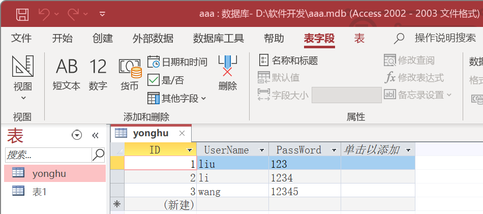 string Access1 = "select * from yonghu where UserName='" + this.textBox1.Text + "'and PassWord='" +