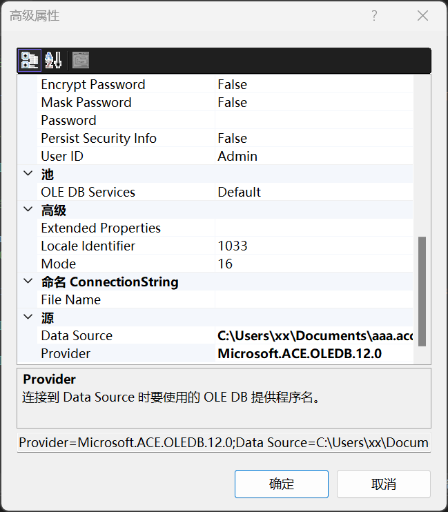 string conStr = "Provider=Microsoft.ACE.OLEDB.12.0;Data Source=C:\Users\xx\Documents\aaa.accdb";
