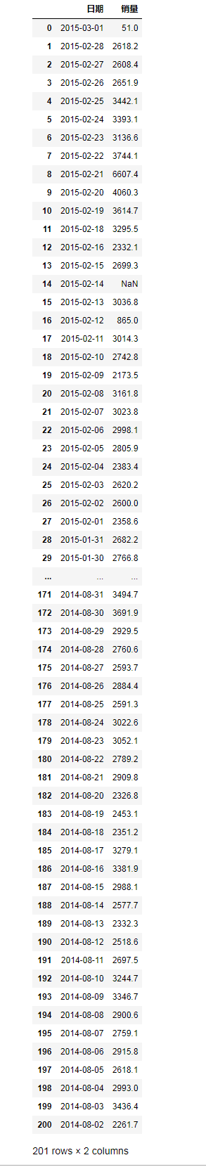 datas.isnull() datas['销量'].isnull() datas.info() missing_value=datas['销量'].shape[0]-datas['销量'].count() missing_rate=missing_value/datas['销量'].shape[0] missing_value <class 'pandas.core.frame.DataFrame'> RangeIndex: 201 entries, 0 to 200 Data columns (total 2 columns): 日期 201 non-null object 销量 200 non-null float64 dtypes: float64(1), object(1) memory usage: 3.2+ KB 1
