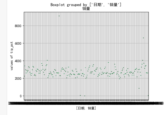 %matplotlib notebook import matplotlib.pyplot as plt import pandas as pd import numpy as np plt.rcParams['font.sans-serif']=[u'SimHei'] plt.rcParams['axes.unicode_minus']=False fig,axes=plt.subplots() datas.boxplot(column='销量',by=['日期','销量'],ax=axes) axes.set_ylabel('values of tip_pct') fig.savefig('p.png')