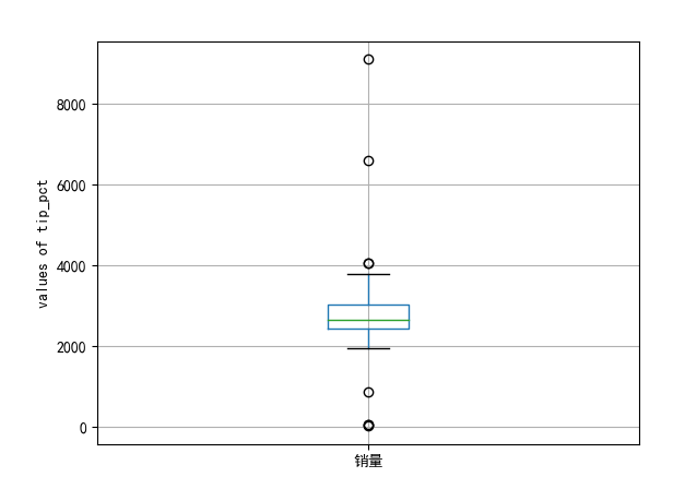 %matplotlib notebook import matplotlib.pyplot as plt import pandas as pd import numpy as np plt.rcParams['font.sans-serif']=[u'SimHei'] plt.rcParams['axes.unicode_minus']=False fig,axes=plt.subplots() datas.boxplot(column='销量',ax=axes) axes.set_ylabel('values of tip_pct') fig.savefig('p.png')
