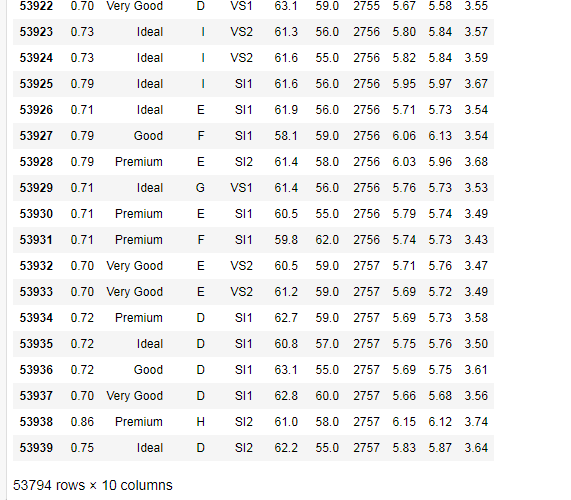由此图可知,diamonds.csv数据集中的十个字段,其中有六个float类型,三个object类型,一个int型。
