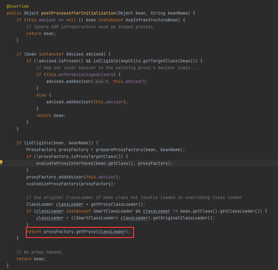 源码如下:入口在AbstractAdvisingBeanPostProcessor.postProcessAfterInitialization(Object bean, String beanName)中
