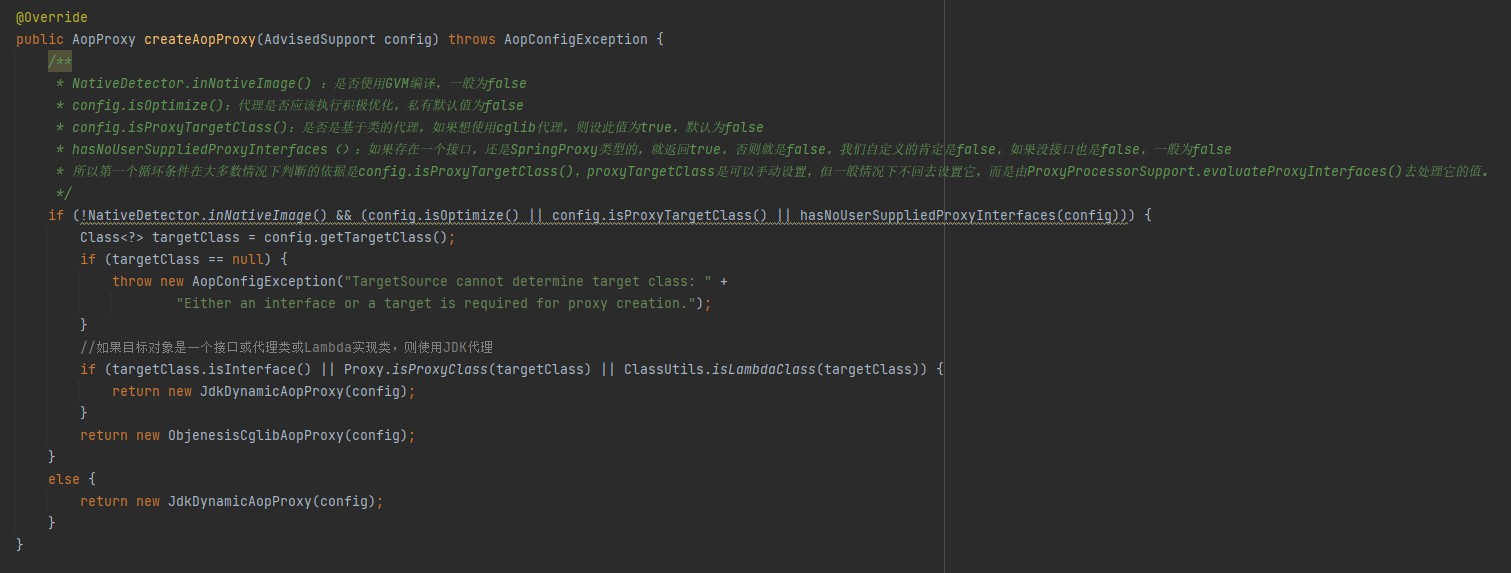 而AopProxyFactory只有一个默认实现:DefaultAopProxyFactory,其中创建代理对象的核心方法为createAopProxy():