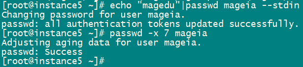 (4)、给用户mageia添加密码,密码为mageedu,并设置用户密码7天后过期