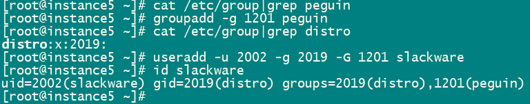 (6)、创建用户slackware,其ID号为2002,基本组为distro,附加组peguin;