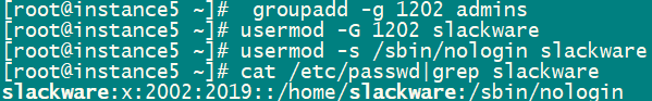 (8)、为用户slackware新增附加组admins,并设置不可登陆。