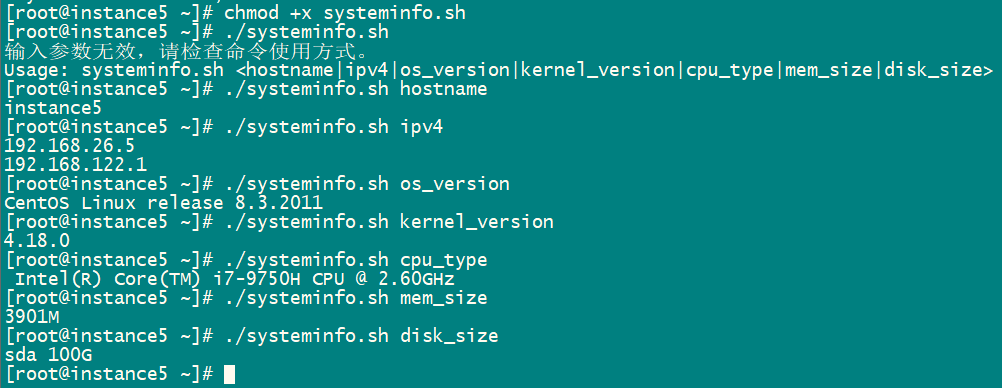 5、编写脚本 systeminfo.sh,显示当前主机系统信息,包括:主机名,IPv4地址,操作系统版本,内核版本,CPU型号,内存大小,硬盘大小
