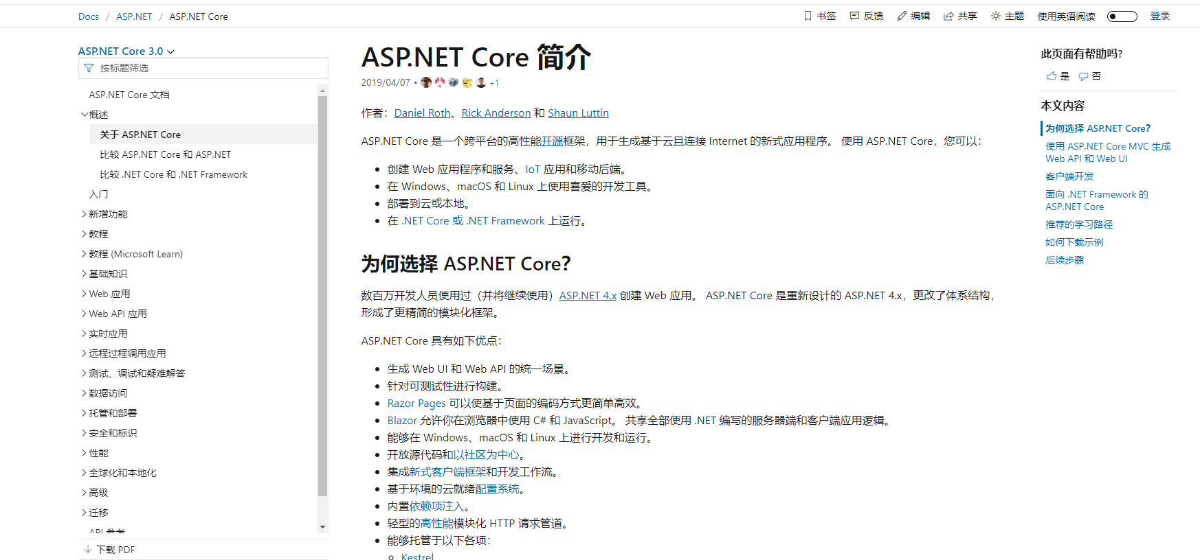 我之前在博客园,看到有一些人说,net core是微软摒弃了framework,其实这是完全错误的理解,net core是基于framework的基础,对于framework中不符合现代互联网的写法,微软开发者进行了修改,使net core更加适应现在互联网的发展,同时,对于当前互联网新兴的变化,微软也时刻在改进,相比其他语言来说,微软对国内开发者是非常友好的,微软是提供中文文档的(如下图),而且非常详细,这在其他语言中,是很少见的,微软的文档,不仅仅是教你如何写代码,更多的是教你理解代码,一个理解代码的人比会写代码更重要。