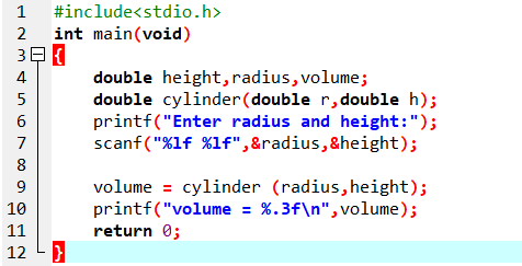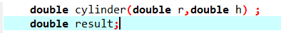 该函数的类型为double,函数名为cylinder,有r,h两个类型都为double的形 参分别表示圆柱体的半径和高度。函数体首先是定义变量result的类型与函数类型一致,来保存函数运算结果,并由return result返回运算结果。