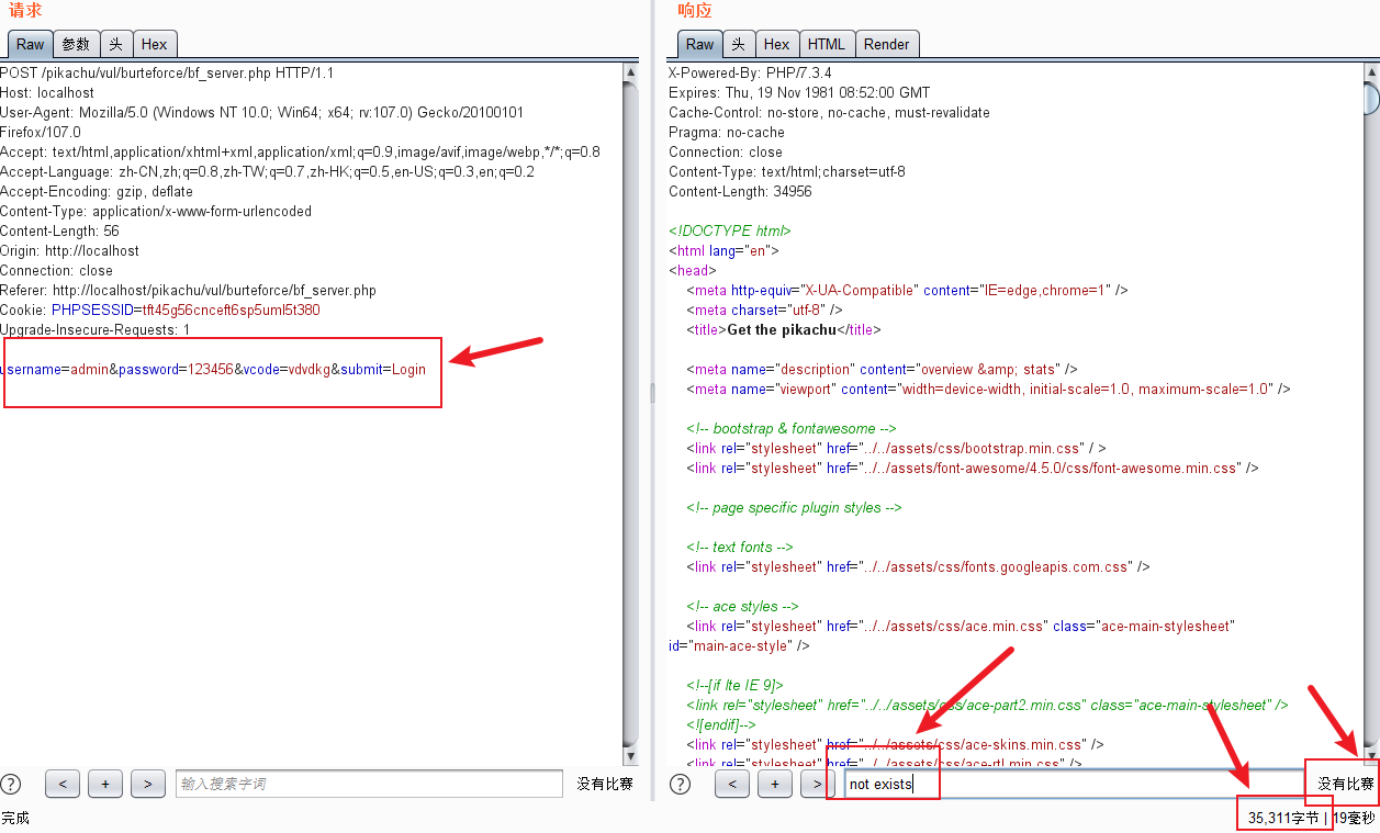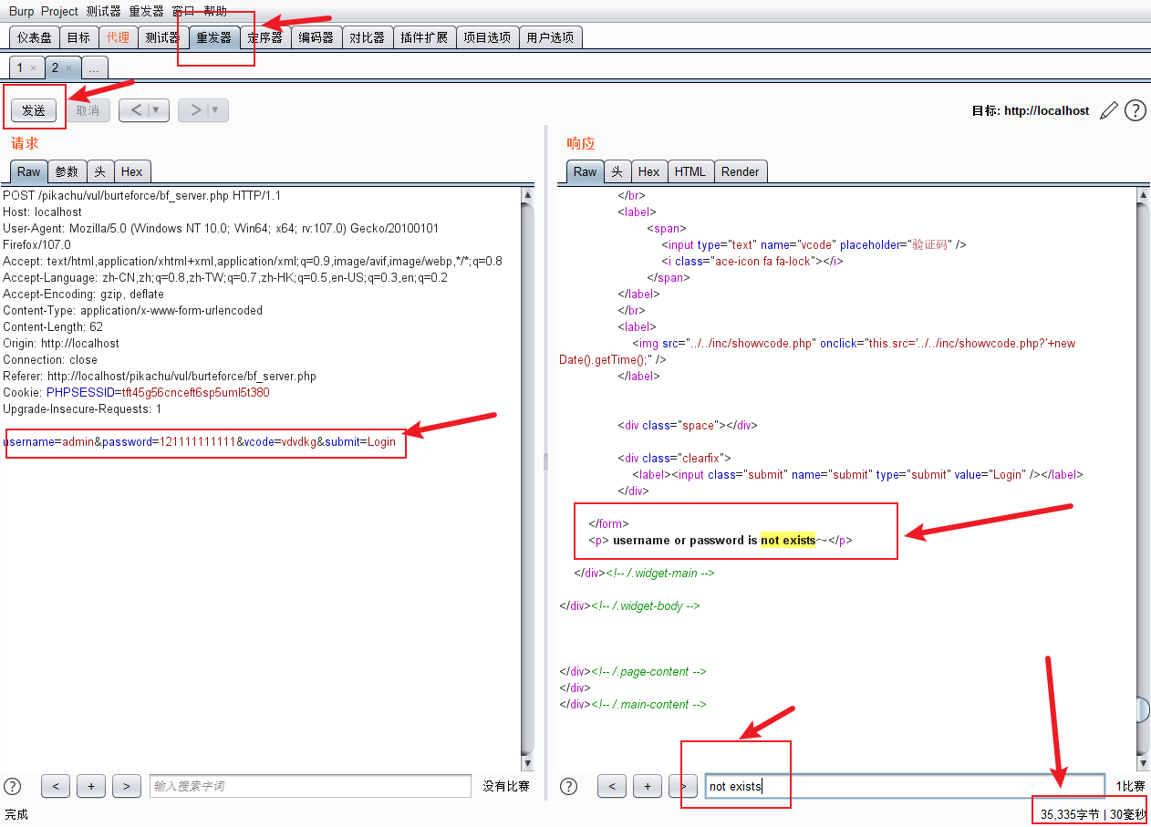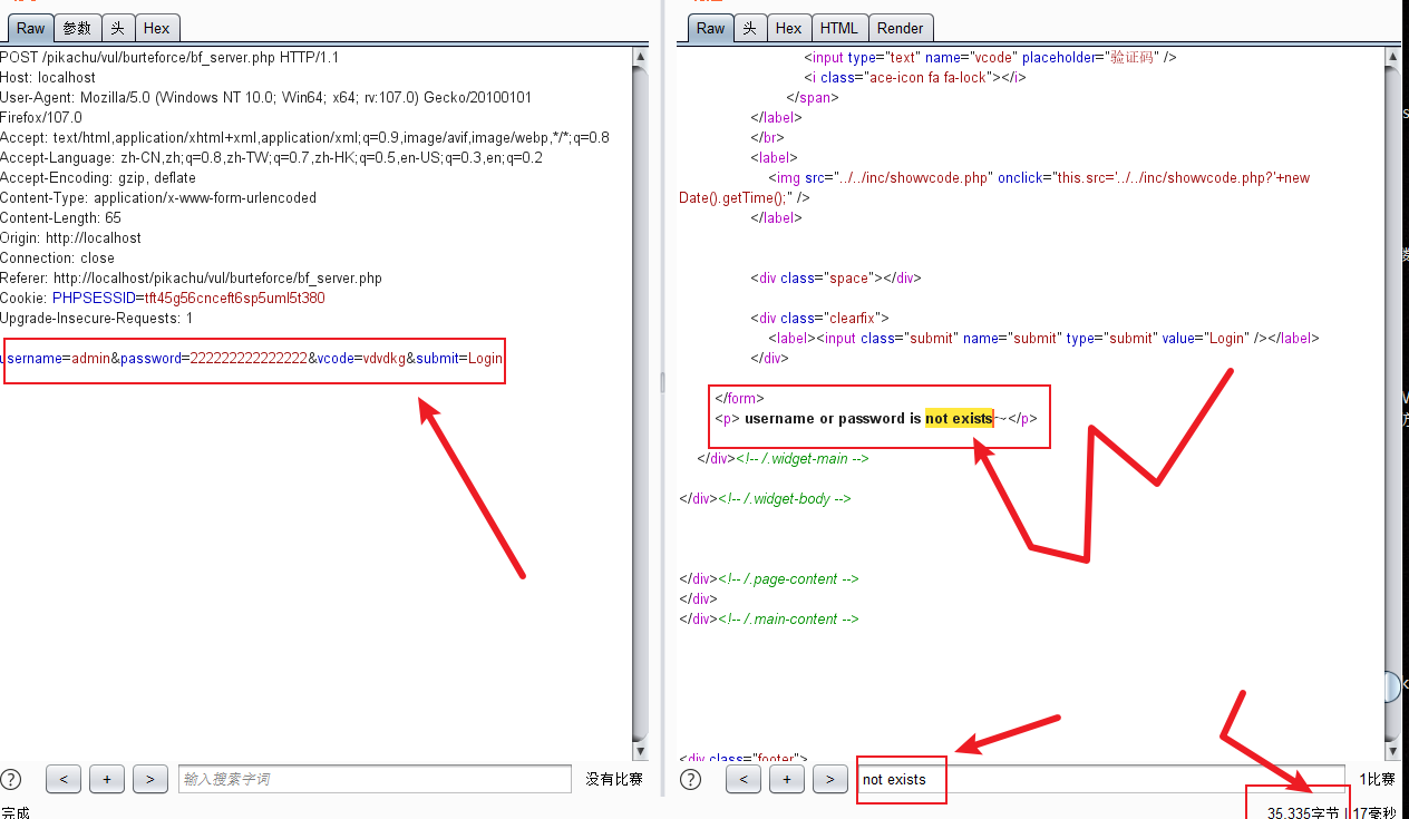 四、先第一遍提交后,发现返回35336字节,提示的是账号或密码不存在,验证码输入的是vdvdkg