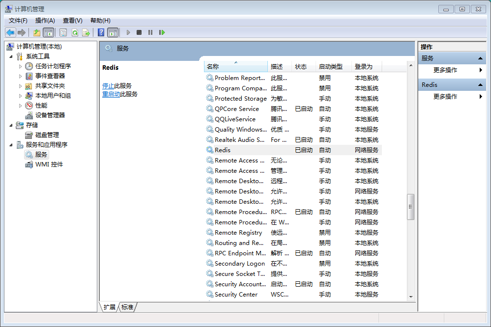 这段命令运行之后,在我的电脑右键->管理->服务,在下图的服务列表里面,我们看到多了个redis。