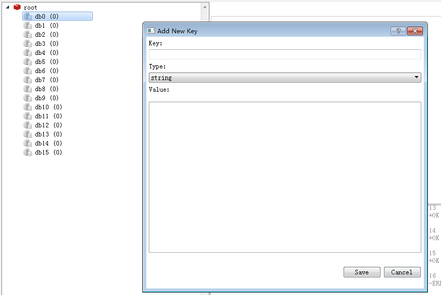 使用起来也很简单,右键随便点击一个db,然后选择 add key,输入key、value、type,这一组值就键入进去了。如图: