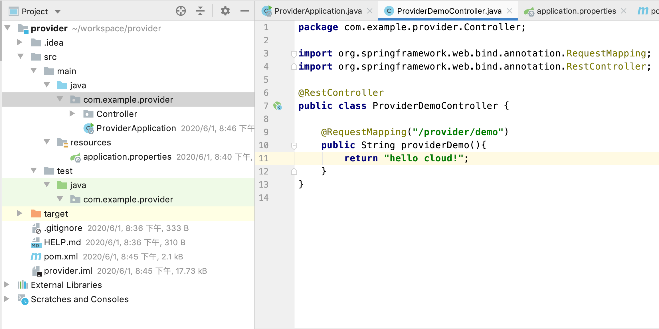 快速构建一个SpringBoot项目,具体构建方法可以参考 https://www.cnblogs.com/m1996/p/13030161.html ,未见简单方便测试,项目只引入 spring-boot-starter-web , 配置文件只暴露接口8080。由于是服务提供者,对外提供一个Controller,直接返回string "hello cloud"。