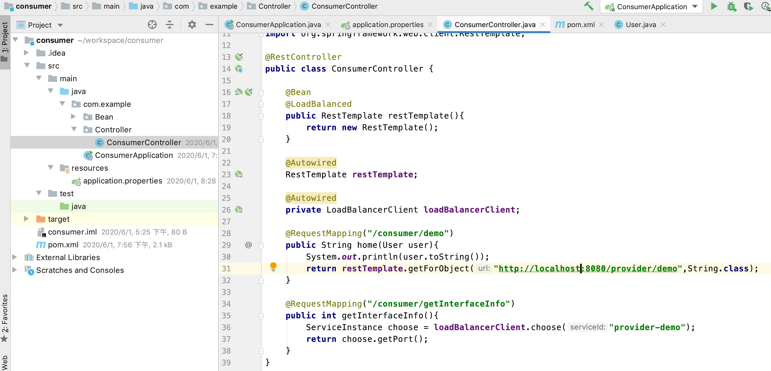 @RestController public class ConsumerController { @Bean @LoadBalanced public RestTemplate restTemplate(){ return new RestTemplate(); } @Autowired RestTemplate restTemplate; @Autowired private LoadBalancerClient loadBalancerClient; @RequestMapping("/consumer/demo") public String home(User user){ System.out.println(user.toString()); return restTemplate.getForObject("http://provider-demo:8080/provider/demo",String.class); } }