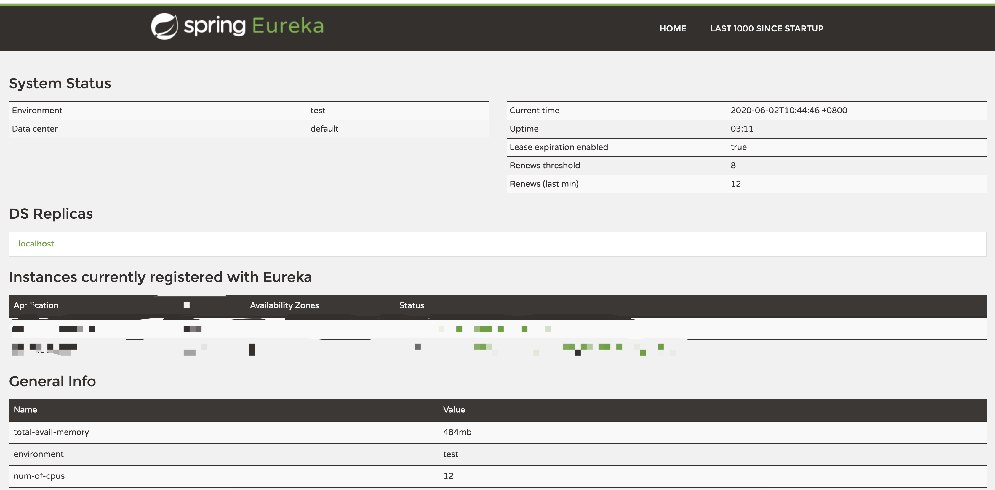 server: port: 8761 eureka: client: register-with-eureka: false fetch-registry: false service-url: defaultZone: http://localhost:8761/eureka/ serviceUrl: defaultZone: http://localhost:8761/eureka/ instance: lease-renewal-interval-in-seconds: 1 lease-expiration-duration-in-seconds: 2