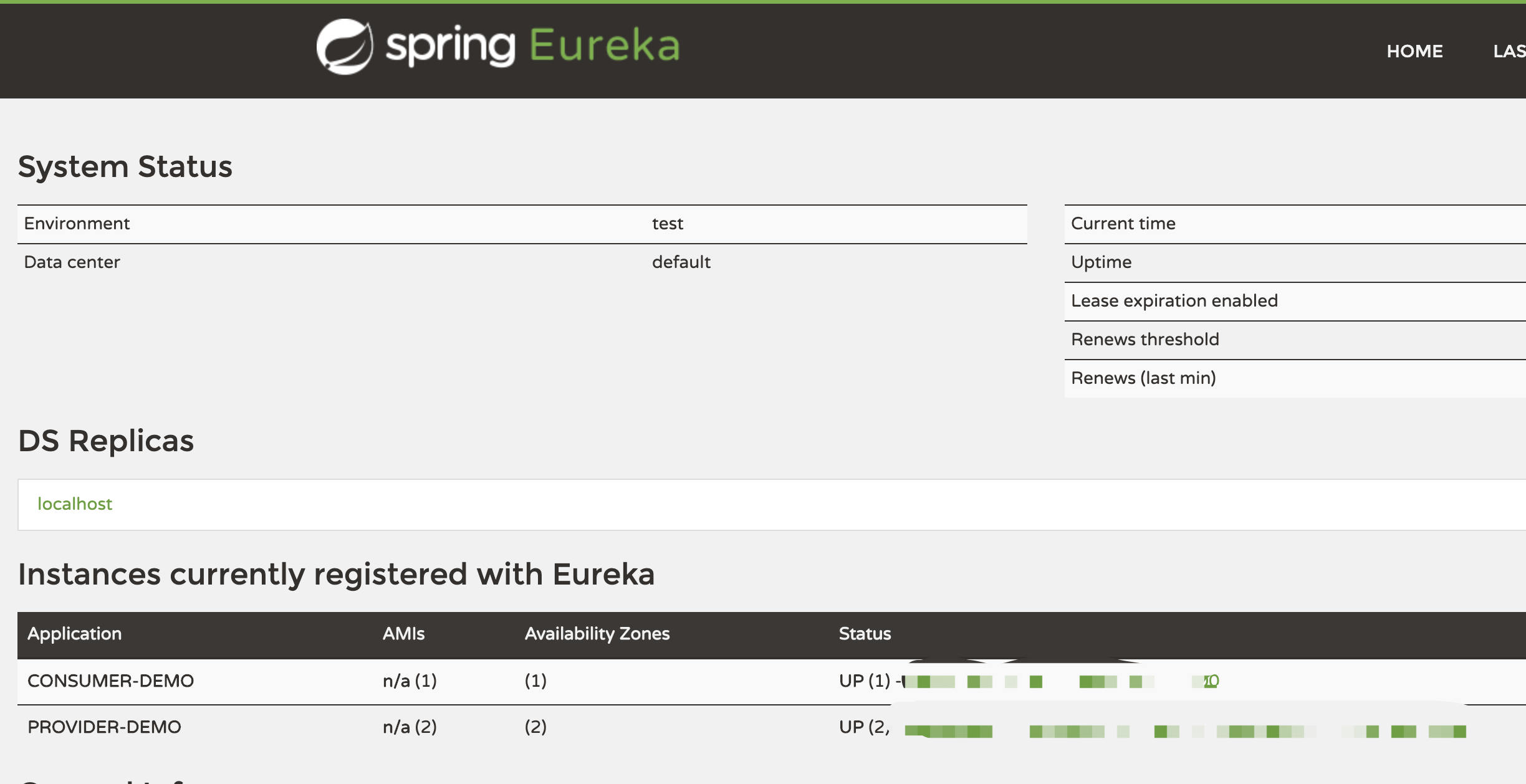 启动项目,打开网页 http://localhost:8761/ 会显示Eureka的实例信息: