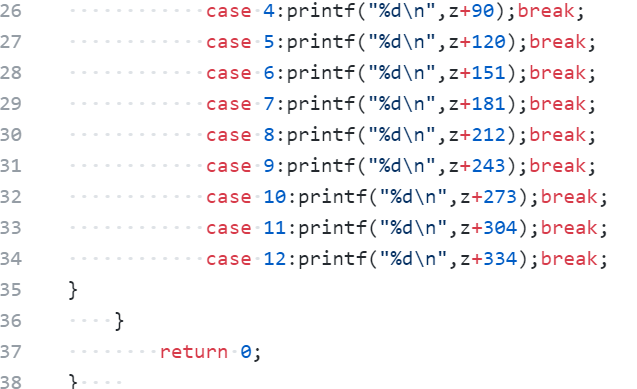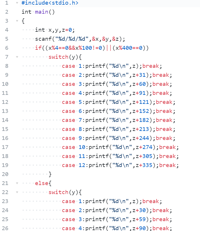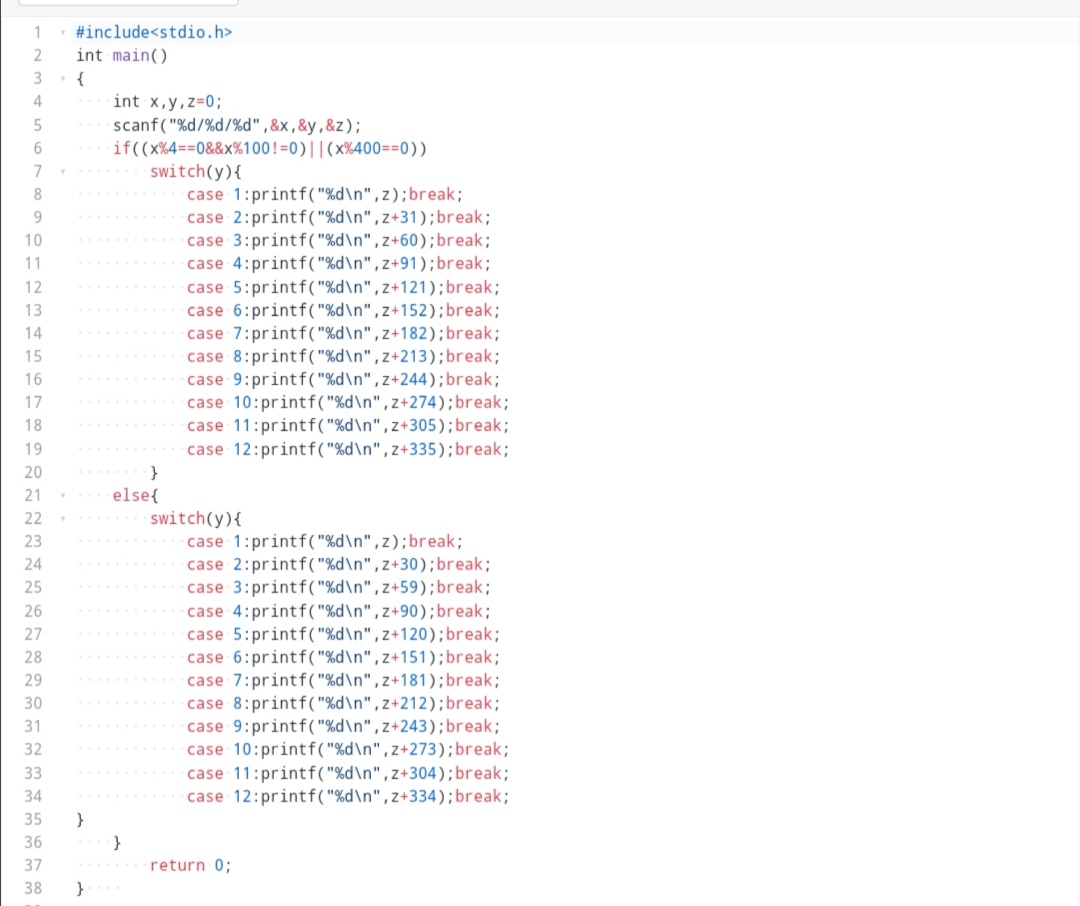 | 题目内容:编写程序计算某年某月某日是该年中的第几天。 | |