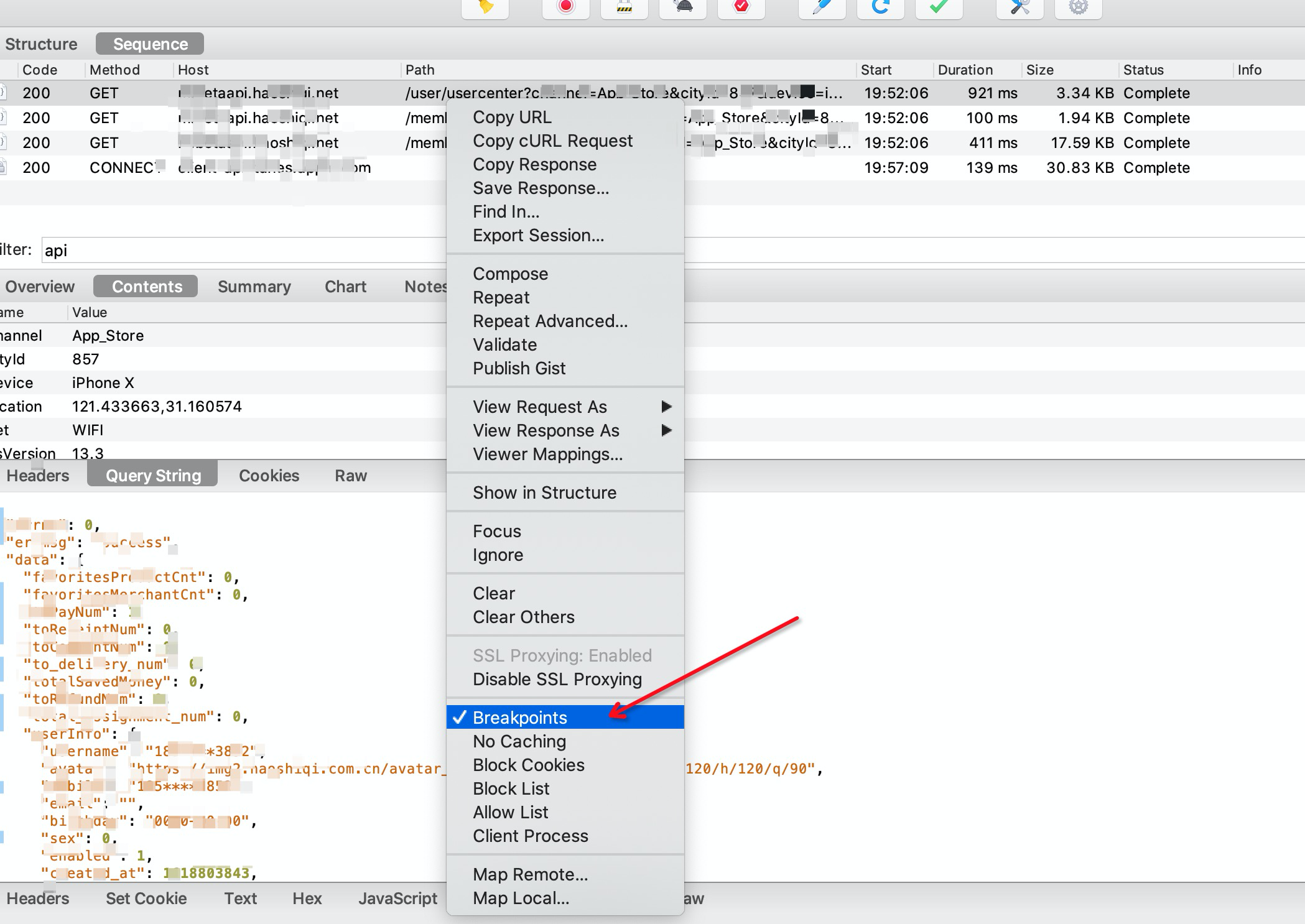 1,选中想要设置断点的接口,右键,点击Breakpoints,
