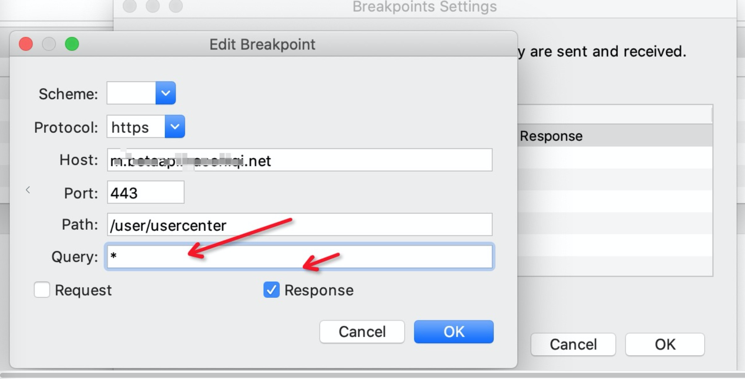 三:把在Edit Breakpoint窗口中显示的接口参数都设置为*,方便以后某些参数变化了,此接口也能正常打断点。由于我只需更改接口的返回值即可进行检查,所以设置断点的时候可以仅选择Response