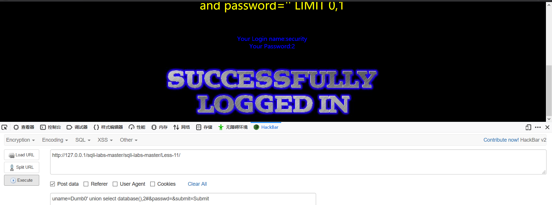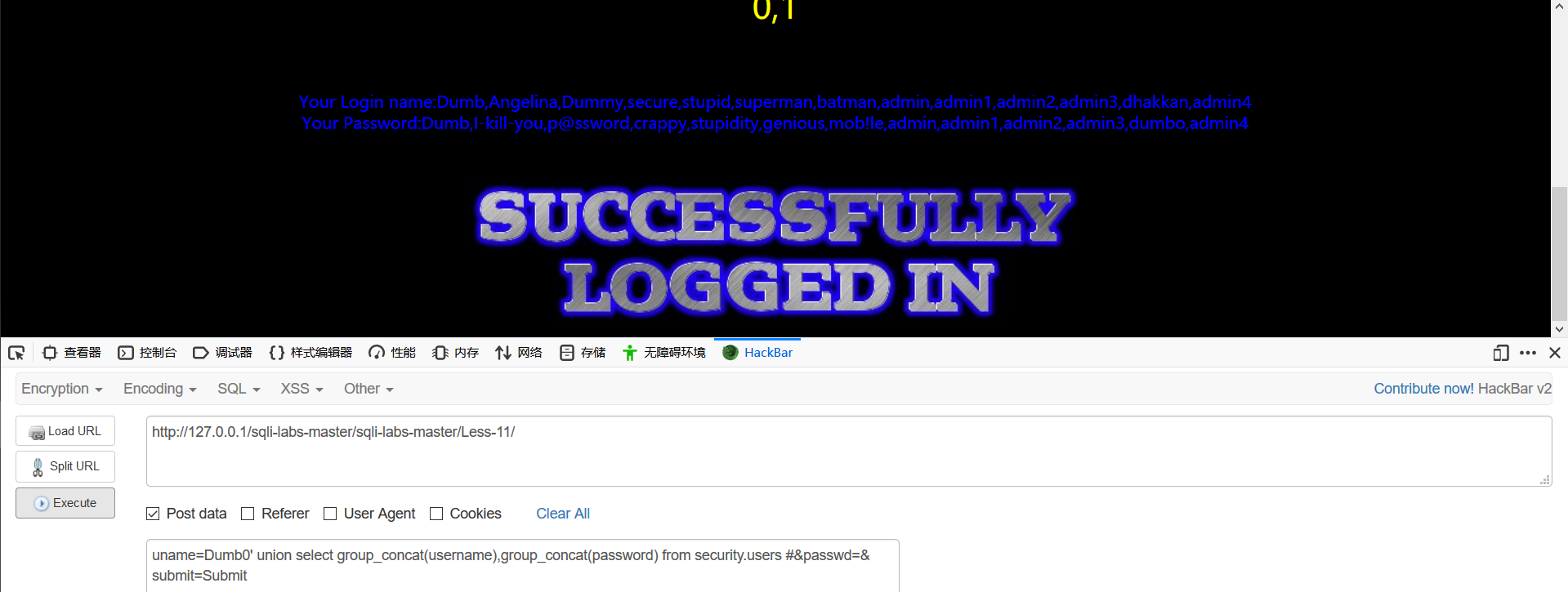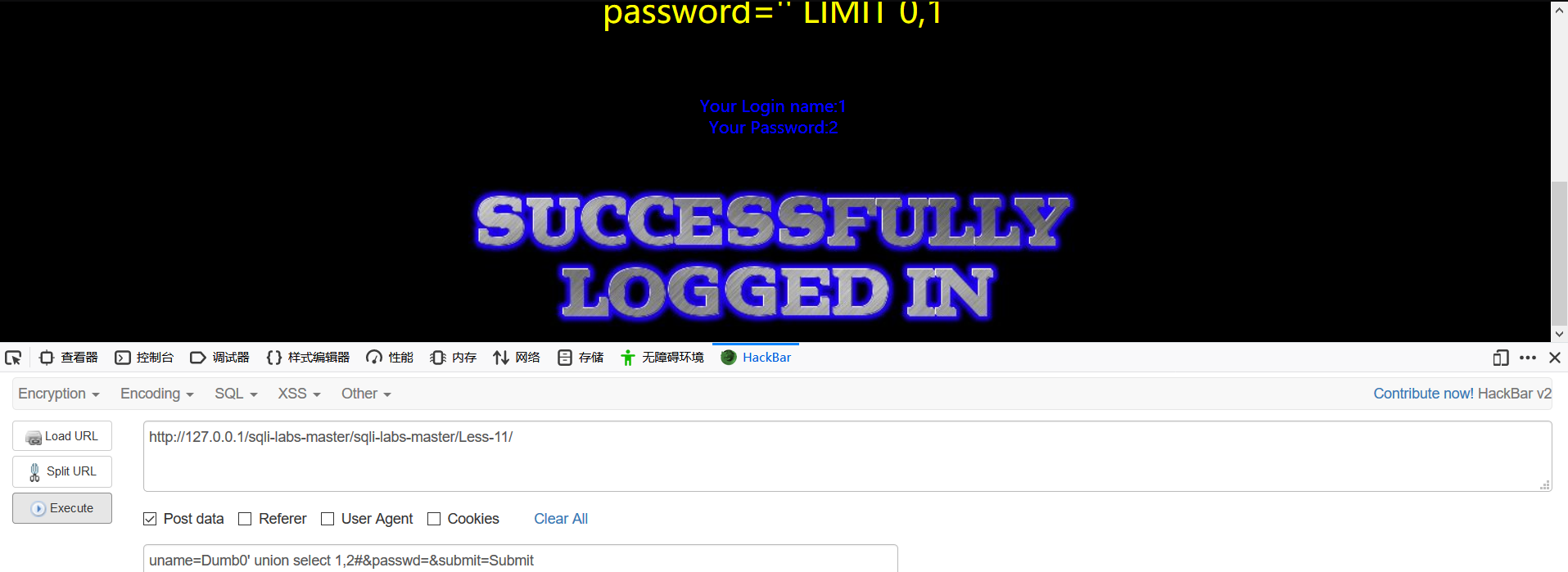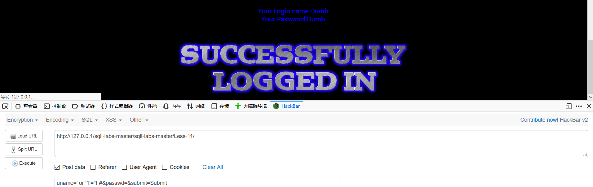 参数就是uname和passwd还有submit了,直接copy到hackbar,直接把password那里注释掉