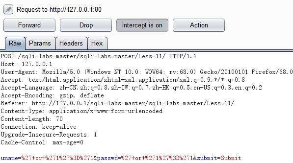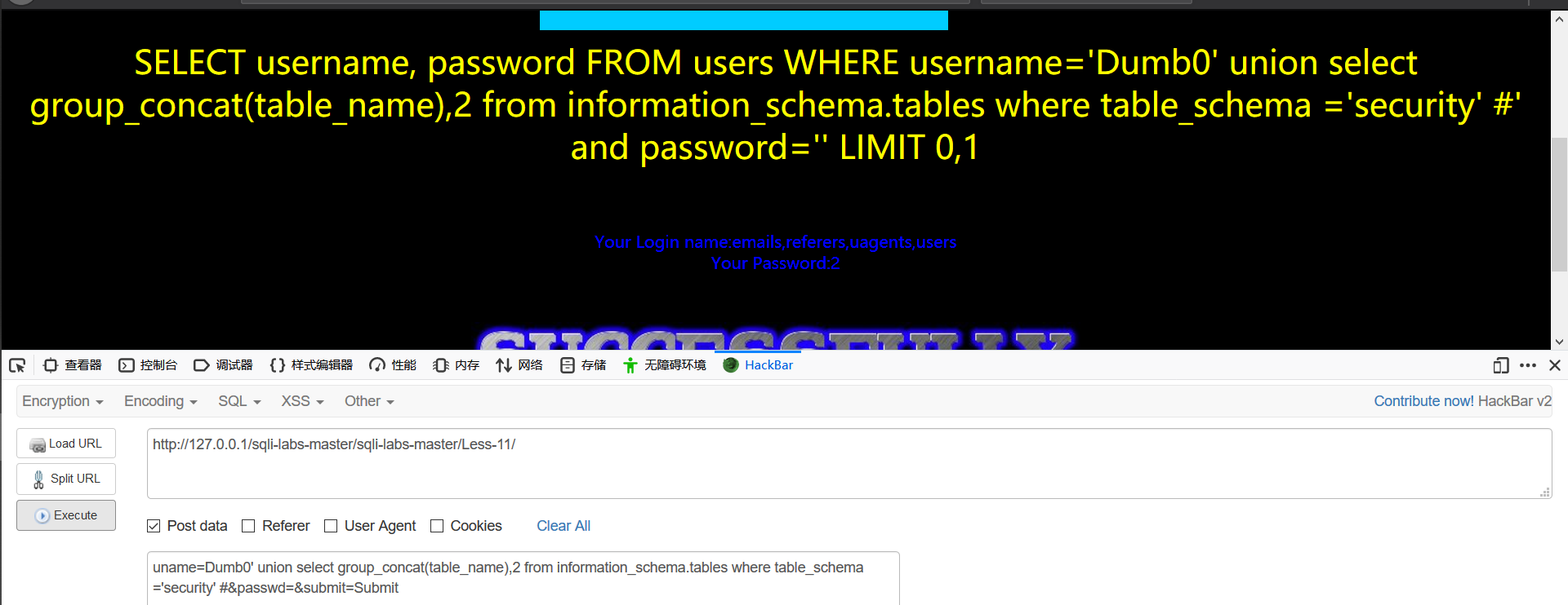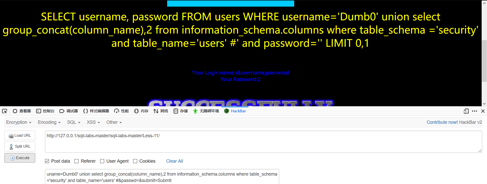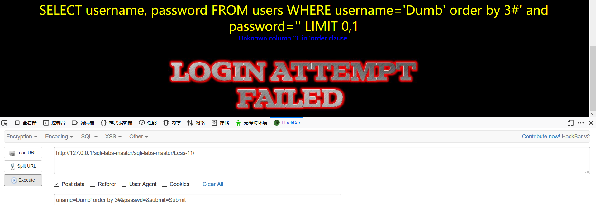 参数就是uname和passwd还有submit了,直接copy到hackbar,直接把password那里注释掉