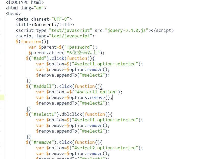 (3)引入jQuery,为四个按钮分别添加单击事件,使用选择器获取元素,对元素进行移除或添加操作