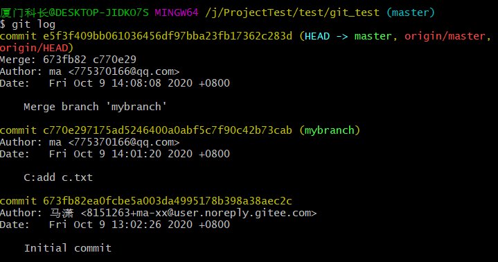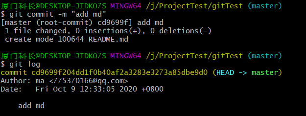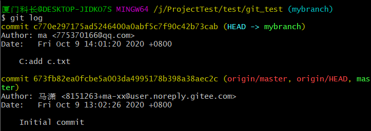 使用log查看日志,可以看见刚才提交的信息,commit-id、auther、提交时间等