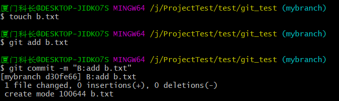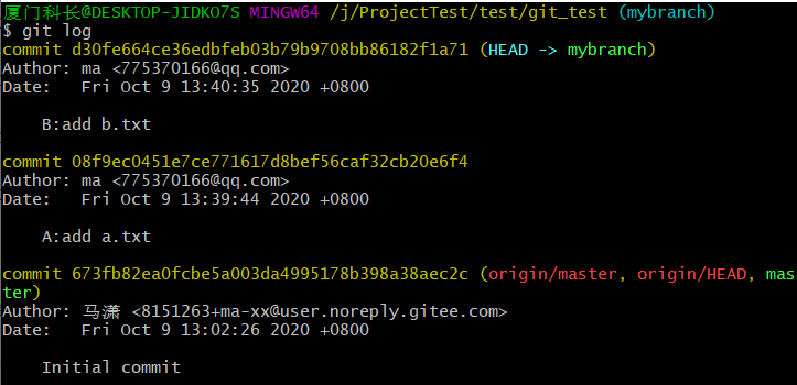 可以看到此时的日志中mybranch分支有两个提交记录,并且HEAD指向B版本,matser还是原来的版本