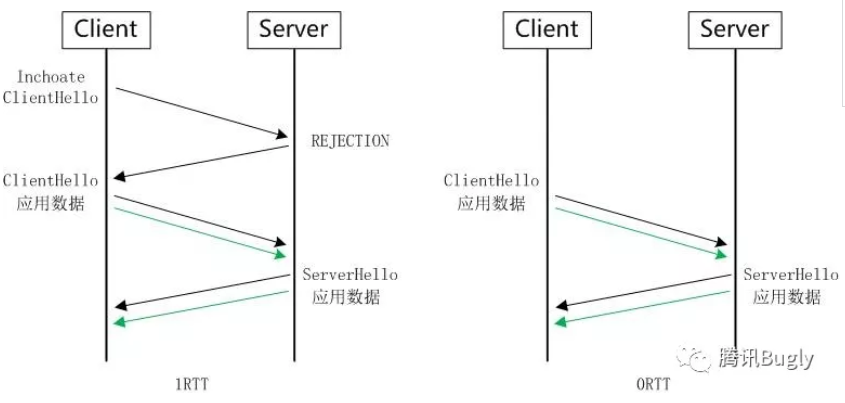 如果连接的是一个新的服务器,这时候client是没有server的任何信息的,当然也不知道用那种密钥交换算法,因此,对于新的QUIC连接至少需要1 RTT才能完成握手