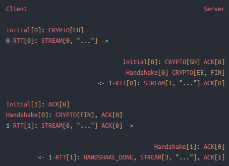 - 低延迟连接的建立:建立一个TCP连接需要进行三次握手,这意味着每次连接都会产生额外的RTT,从而给每个连接增加了显著的延迟。另外,如果还需要TLS协商来创建一个安全的、加密的https连接,那么就需要更多的RTT,无疑会产生更大的延迟。而QUIC协议可以在1个RTT中启动一个连接并且获取完成握手所需的必要信息: