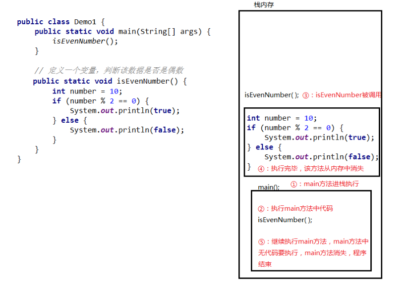 - 总结:每个方法在被调用执行的时候,都会进入栈内存,并且拥有自己独立的内存空间,方法内部代码调用完毕之后,会从栈内存中弹栈消失。