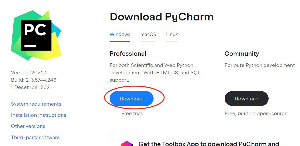 pycharm官网:https://www.jetbrains.com/pycharm/下载安装包