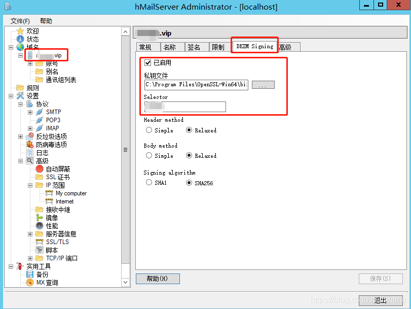 在hMailServer管理控制台,进入DKIM Signing设置,设置如下: