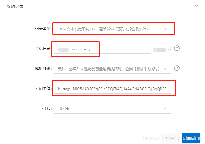 在邮件所用域名的解析处,添加TXT记录,主机记录为:标识符._domainkey,如test._domailkey,这个test可以是任意字符,下面要用到,记录值为:k=rsa;p=公钥密文,如下图: