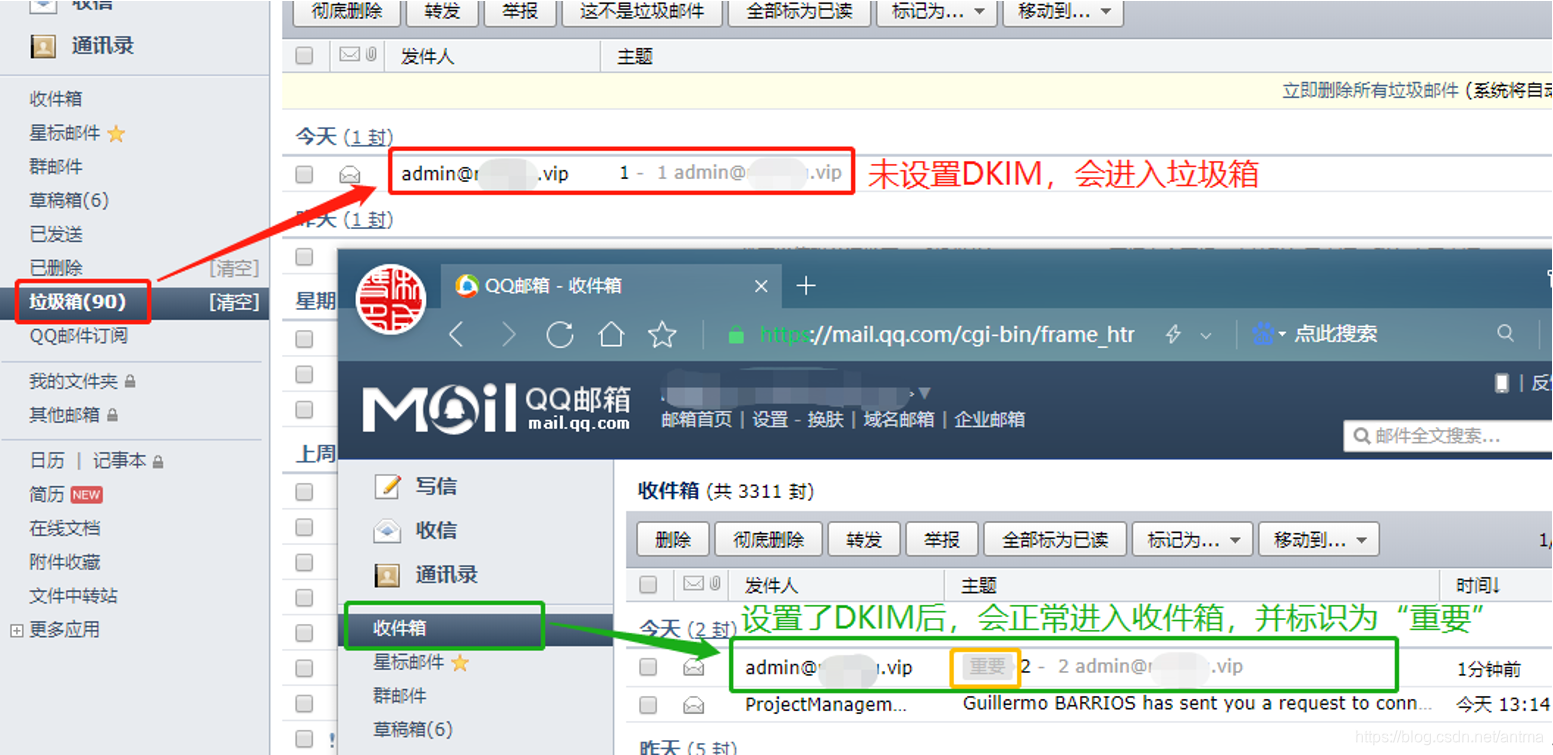 可以看到,未设置DKIM的时候,发到qq邮箱的邮件会进入垃圾箱,设置DKIM以后,会正常进入收件箱。