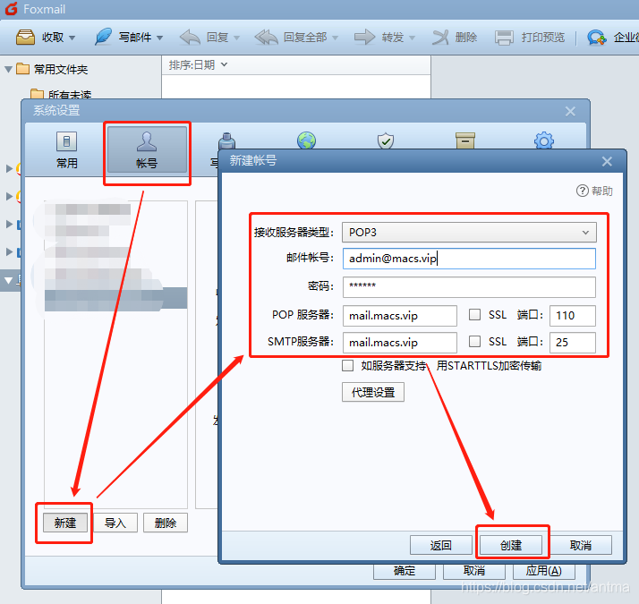 配置邮箱客户端,这里用的 Foxmail,配置如下: